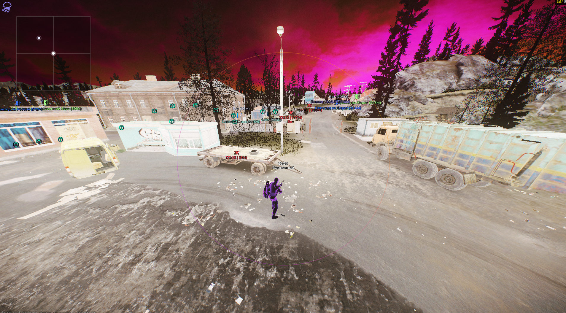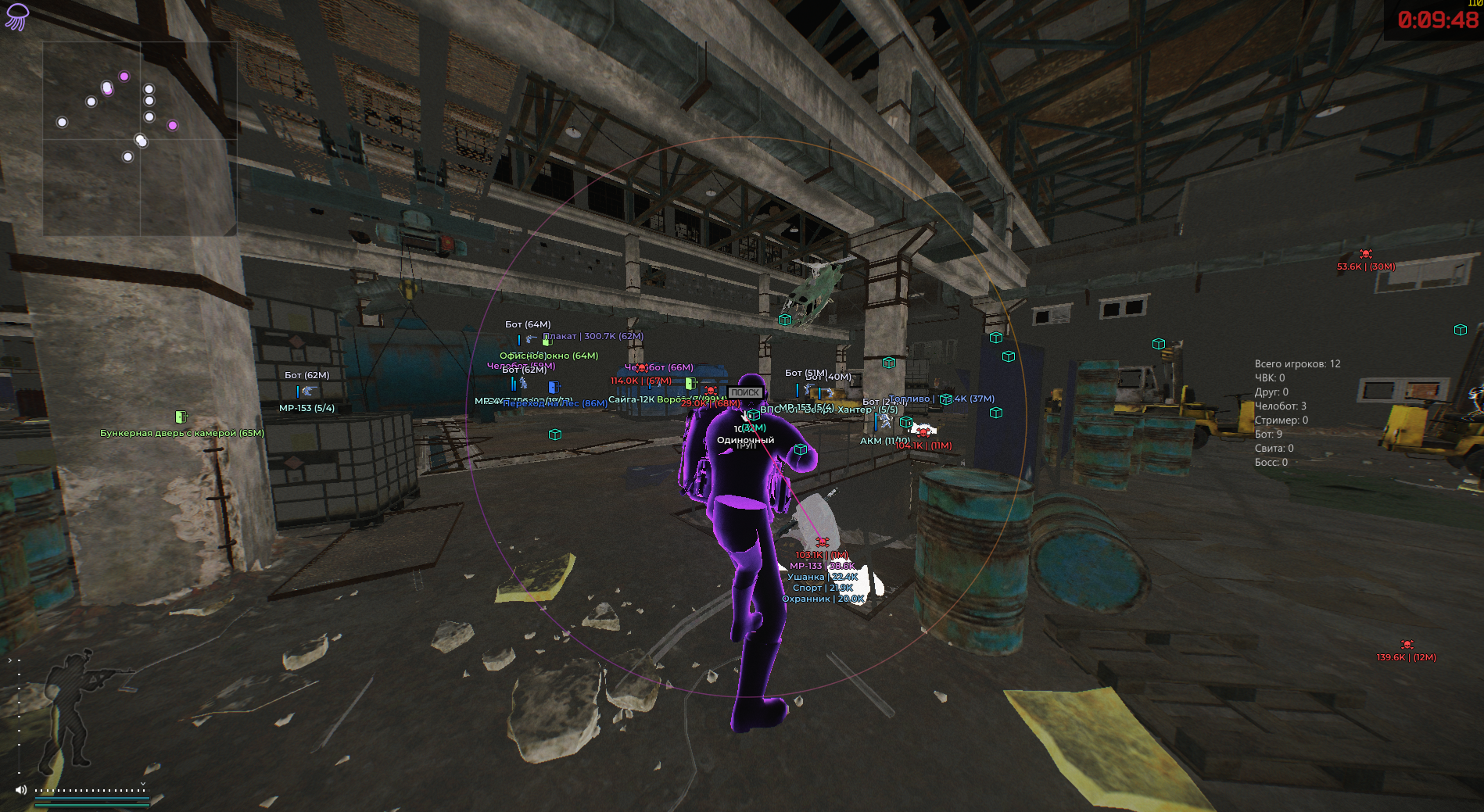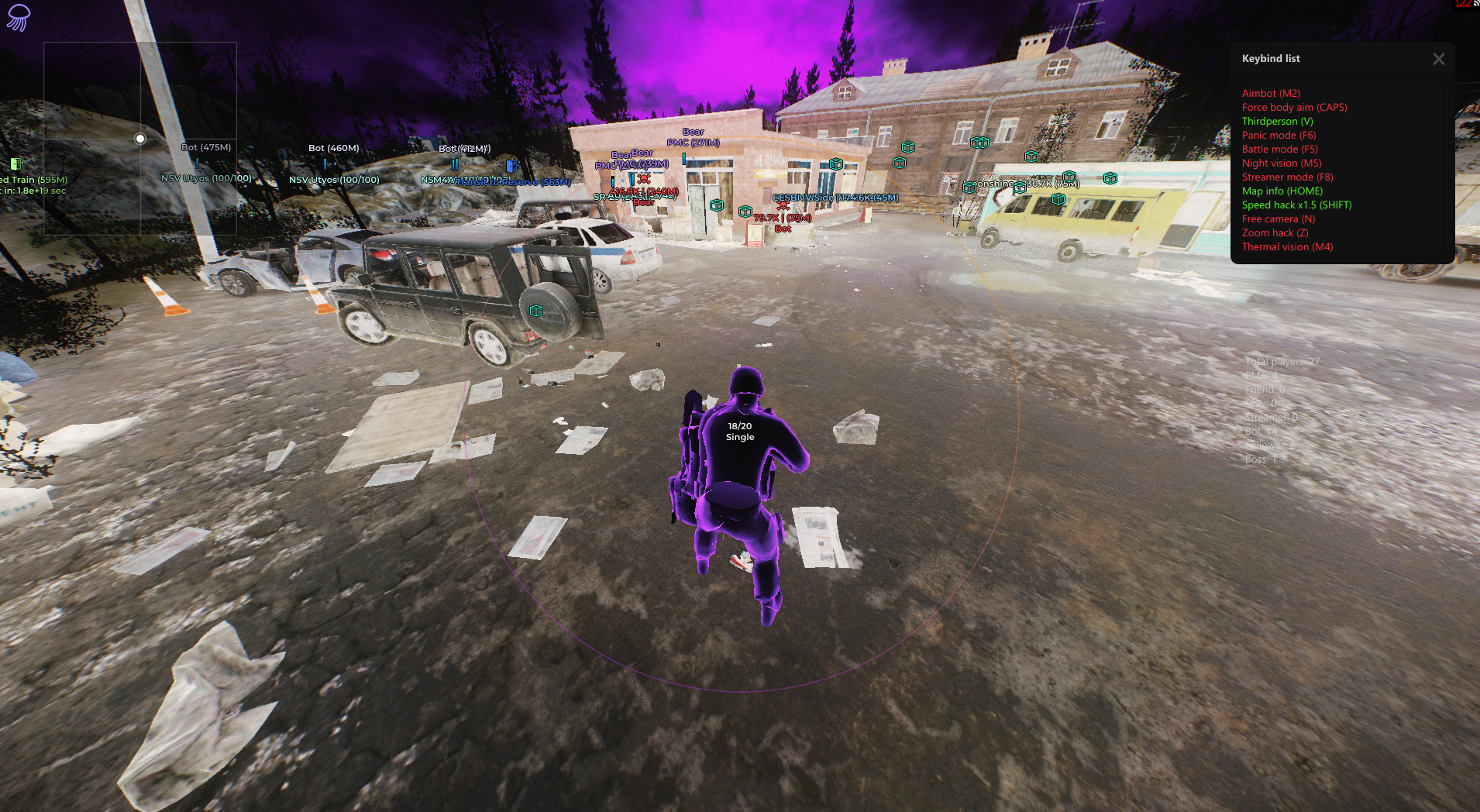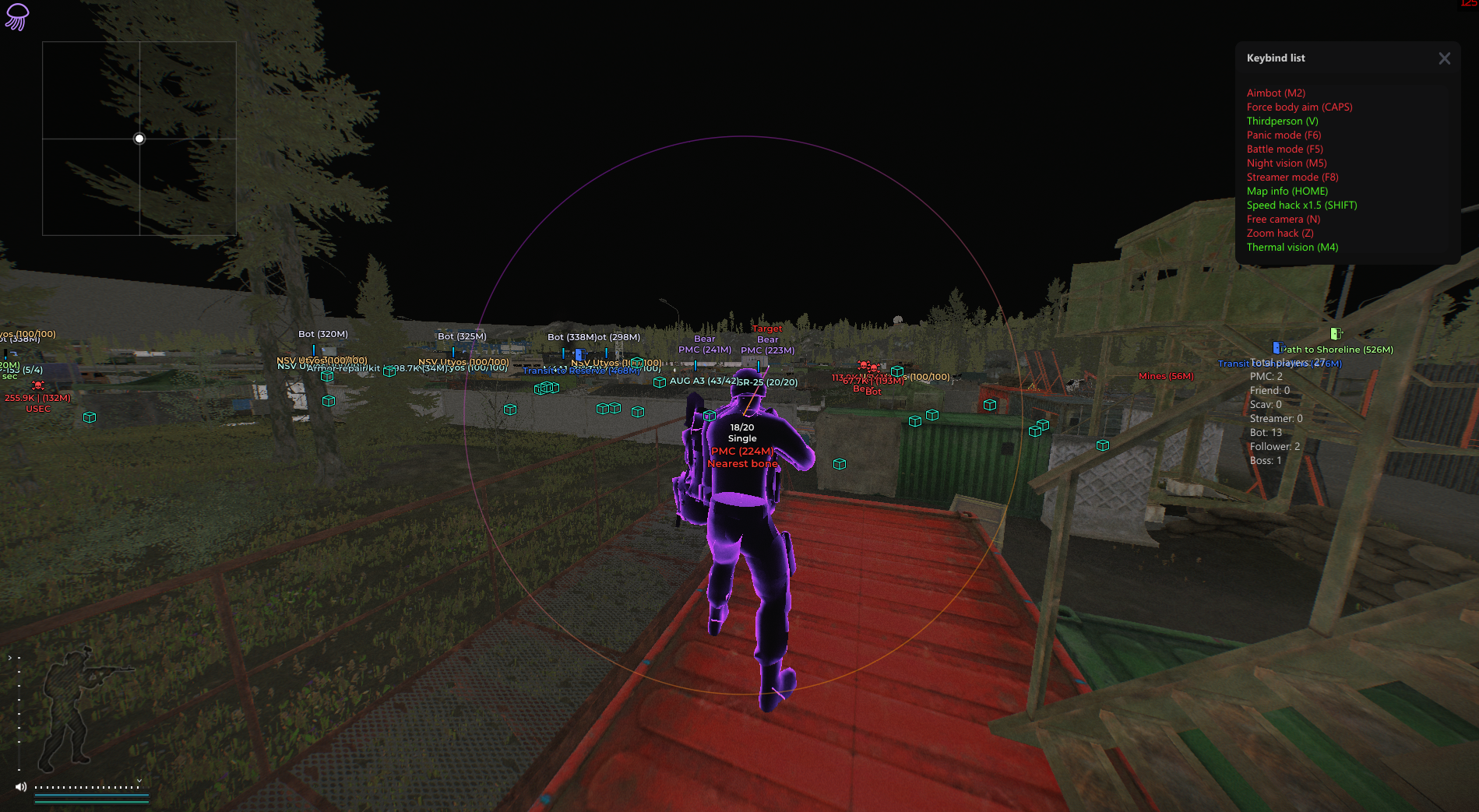- Аимбот — модуль автоматического прицеливания с возможностью приоритезации зон поражения (корпус/ноги/отдельные кости), настраиваемым радиусом захвата и максимальной дистанцией. Поддерживает мгновенное попадание (Instant hit) без учета баллистики. В модуль встроена система фильтрации целей по ролям (PMC, Friend, боты и др.), отображение информации о захваченной цели, а также визуальные элементы: линия до цели (с выбором типа Solid/Gradient), контур и заливка радиуса действия с опциональной анимацией (Static/Animated) и настраиваемыми цветами.